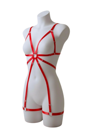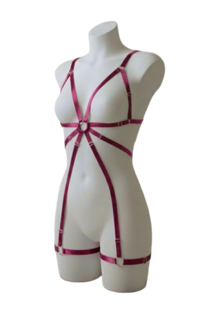 Arnés de cuerpo completo elaborado en elástico satinado de 1cm de ancho, con ajustadores y aros metálicos. Se ajusta de (casi) todas las tiras por lo que funciona a todo tipo de cuerpo.