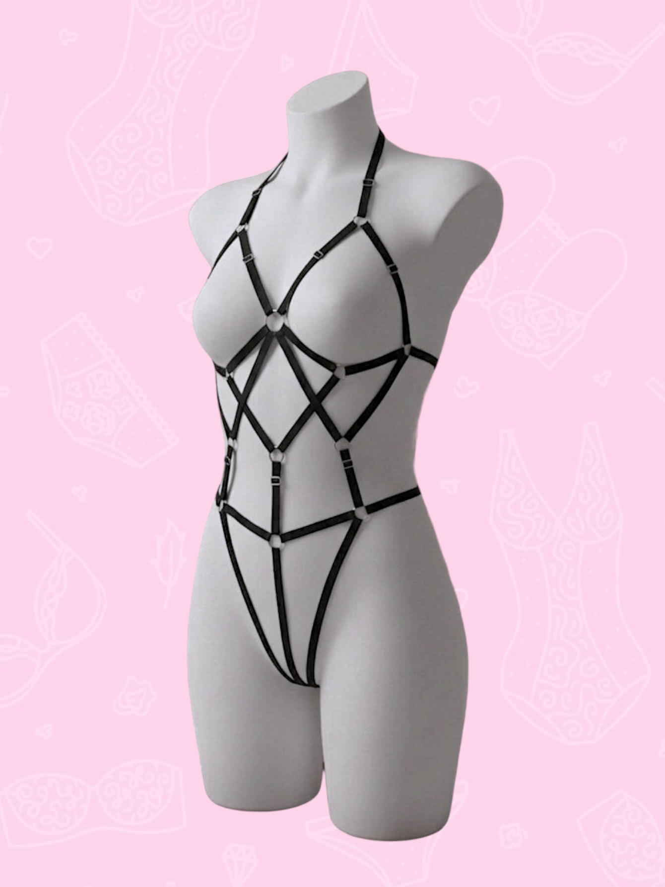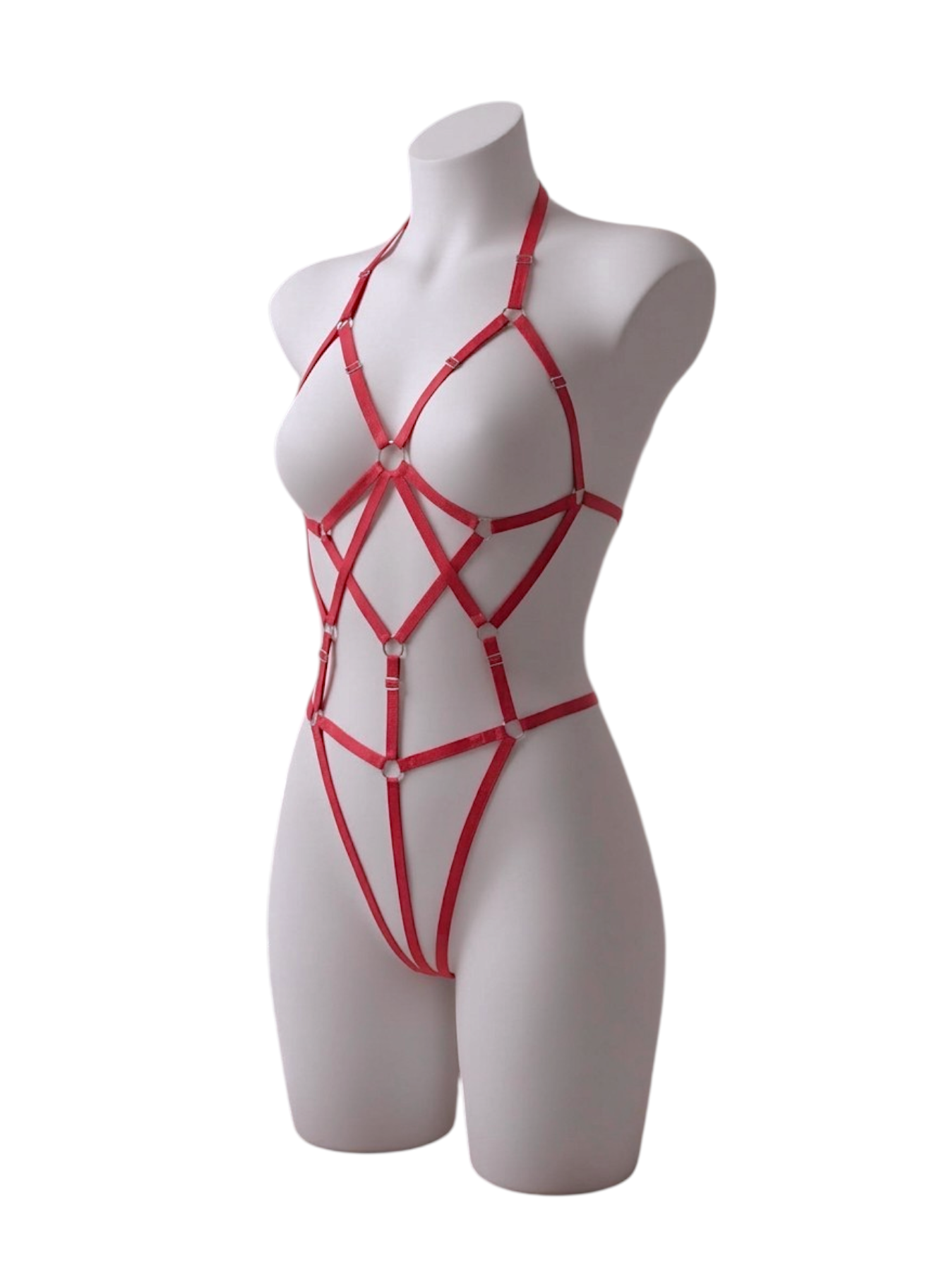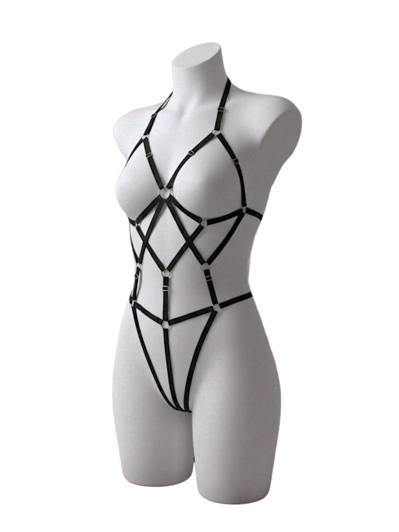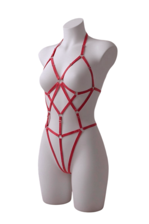 Arnés de cuerpo completo elaborado en elástico satinado de 1cm de ancho, con ajustadores y aros metálicos. Se ajusta de (casi) todas las tiras por lo que funciona a todo tipo de cuerpo. Por detrás es tipo hilo y el cuello es tipo halter.