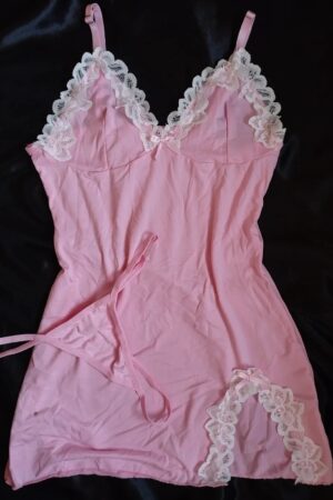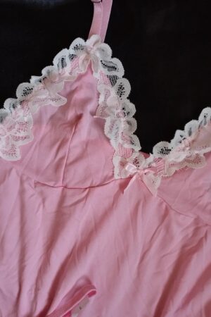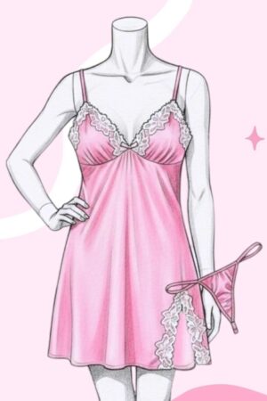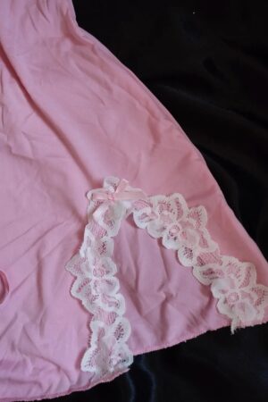Pijama tipo slip o albornoz muy adorable y comodo elaborado en tela suave y elástica con detalles de encaje blanco. Recta con abertura pequeña en la parte inferior. Ajustable de tiras de hombros. Incluye hilo.