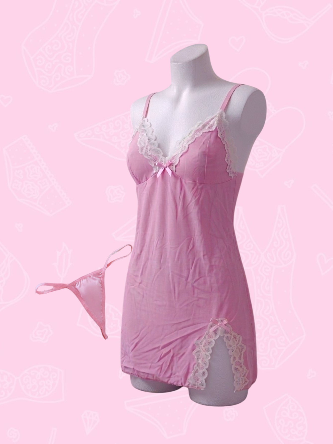 Pijama tipo slip o albornoz muy adorable y comodo elaborado en tela suave y elástica con detalles de encaje blanco. Recta con abertura pequeña en la parte inferior. Ajustable de tiras de hombros. Incluye hilo.