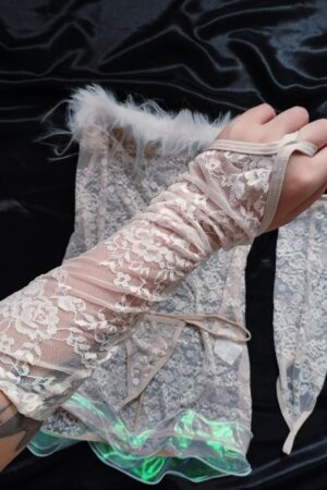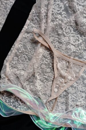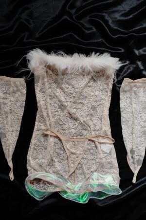 Babydoll lencero muy sexy y delicado encaje elastico semi traslucido color crema con detalle de peluche en busto y ruedo en relieve tornasol. Incluye hilo y mangotes a juego.