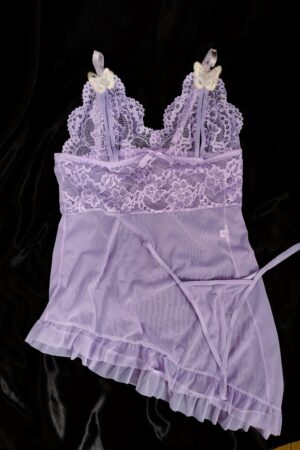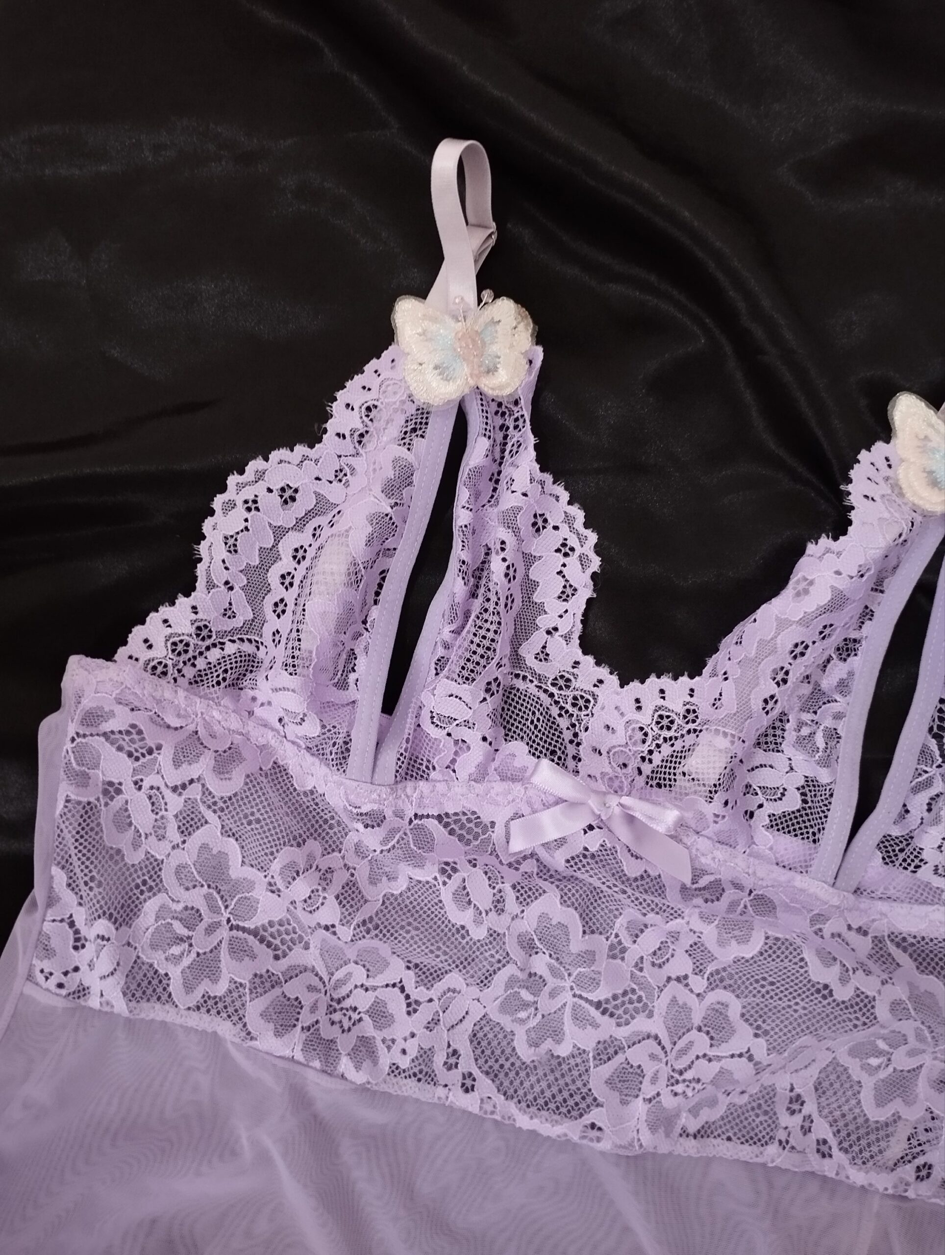 Babydoll lencero muy adorable elaborado en malla traslucida con parte superior de encaje y detalles de mariposas. Incluye hilo a juego.
