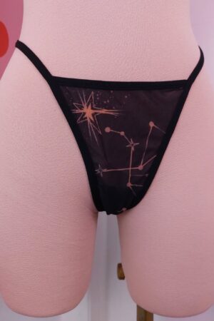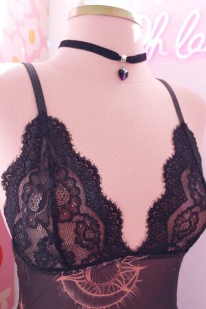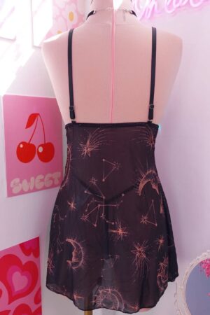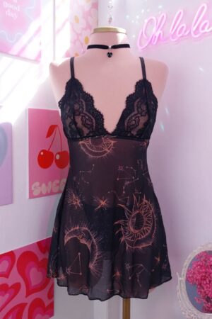 Babydoll de encaje suave negro y malla semitraslucida con estampado de lunas, soles y estrellas estilo mistico, incluye un hilo a juego con el mismo patron.