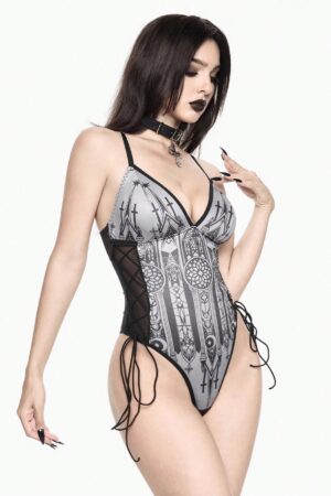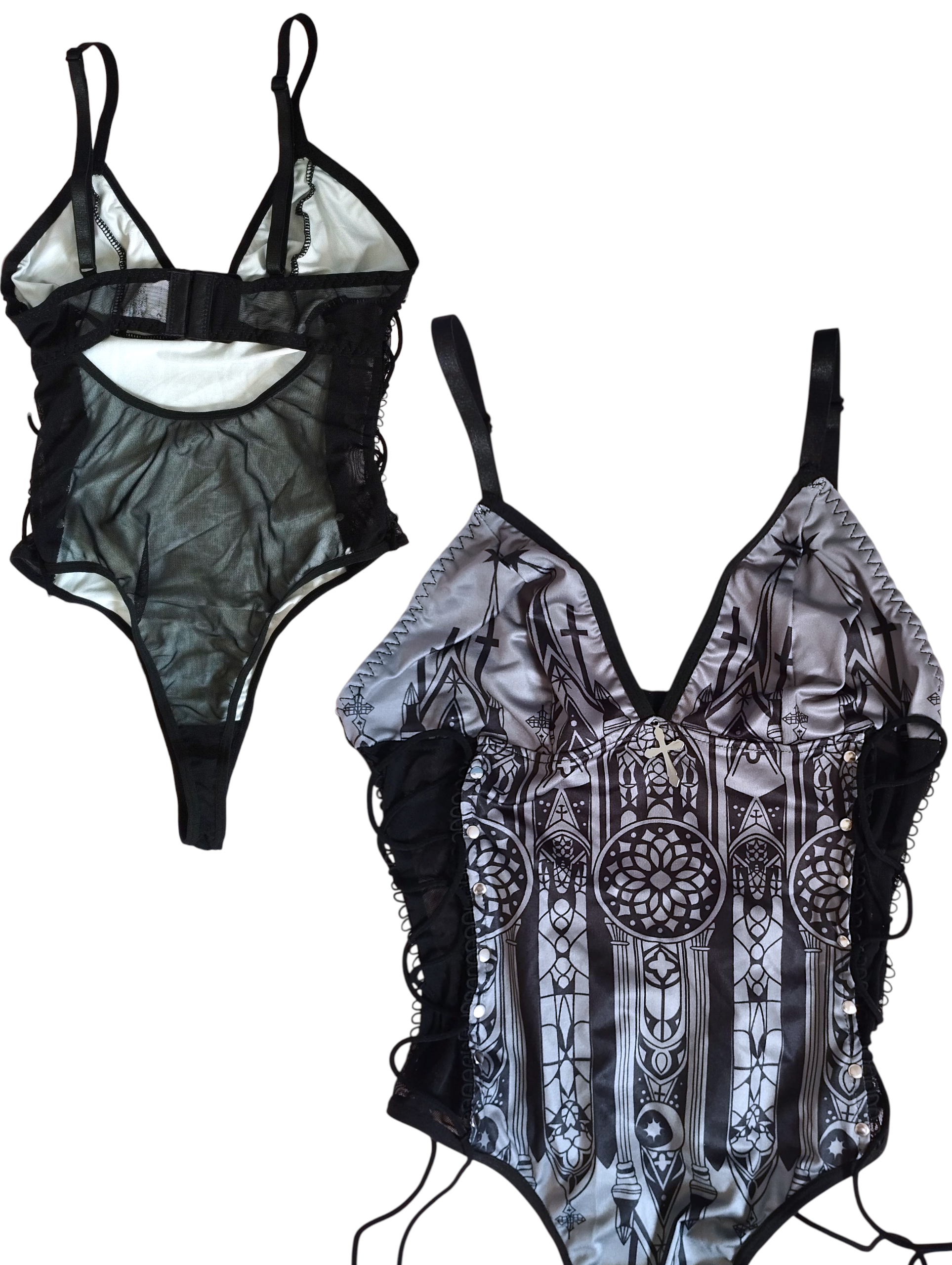 Goth vibes only 🖤 Body licrado con estampado de capilla gotica en la parte frontal y detalle de cruz metálica en el centro del busto. Laterales y parte trasera de malla traslúcida. Con detalles de trenzado a los lados.