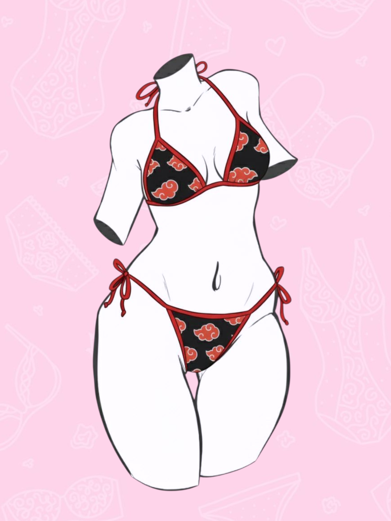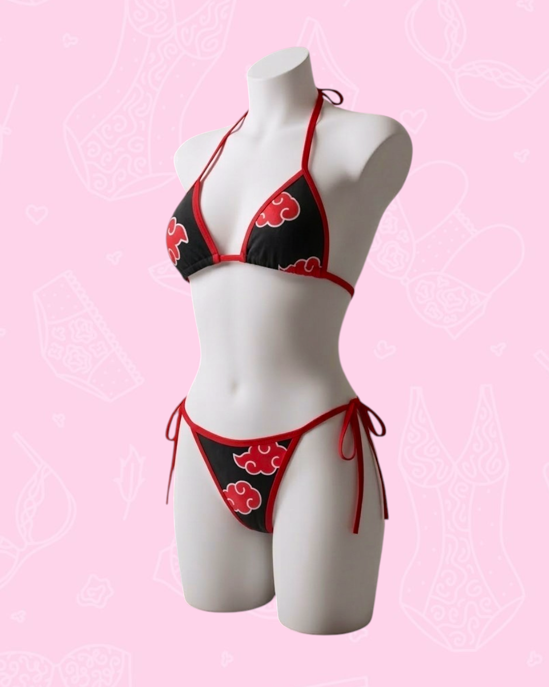 Set estampado de akatsuki diseñado originalmente por nosotros. Elaborado en microfibra, con bordes en sesgo elastico mate. Ajustable de cuello, espalda, panty y bra (los triangulos pueden ajustarse para que cubran segun se desee.)