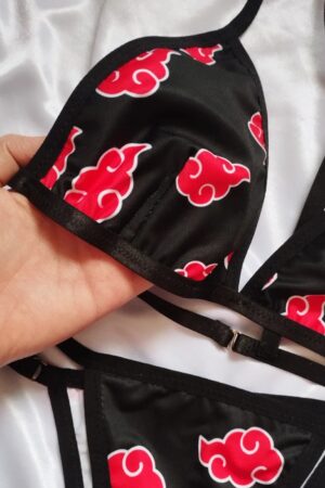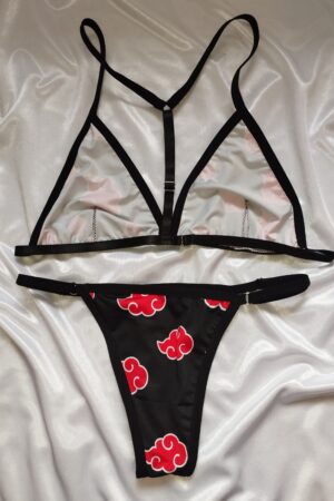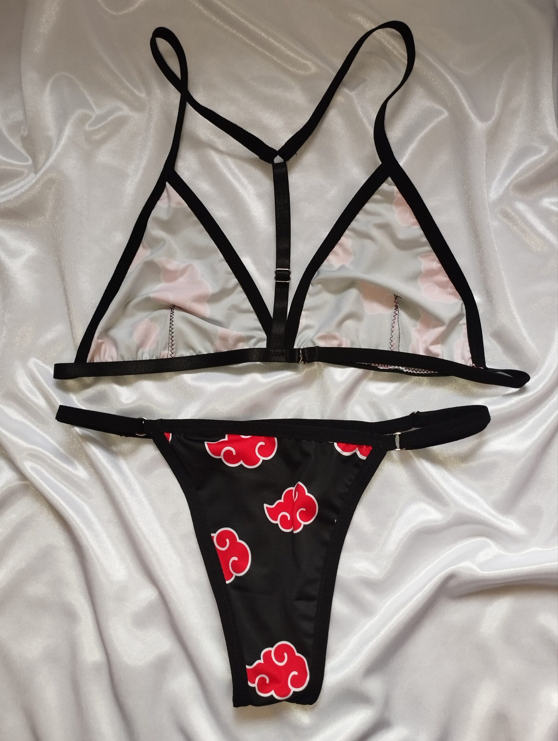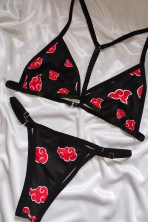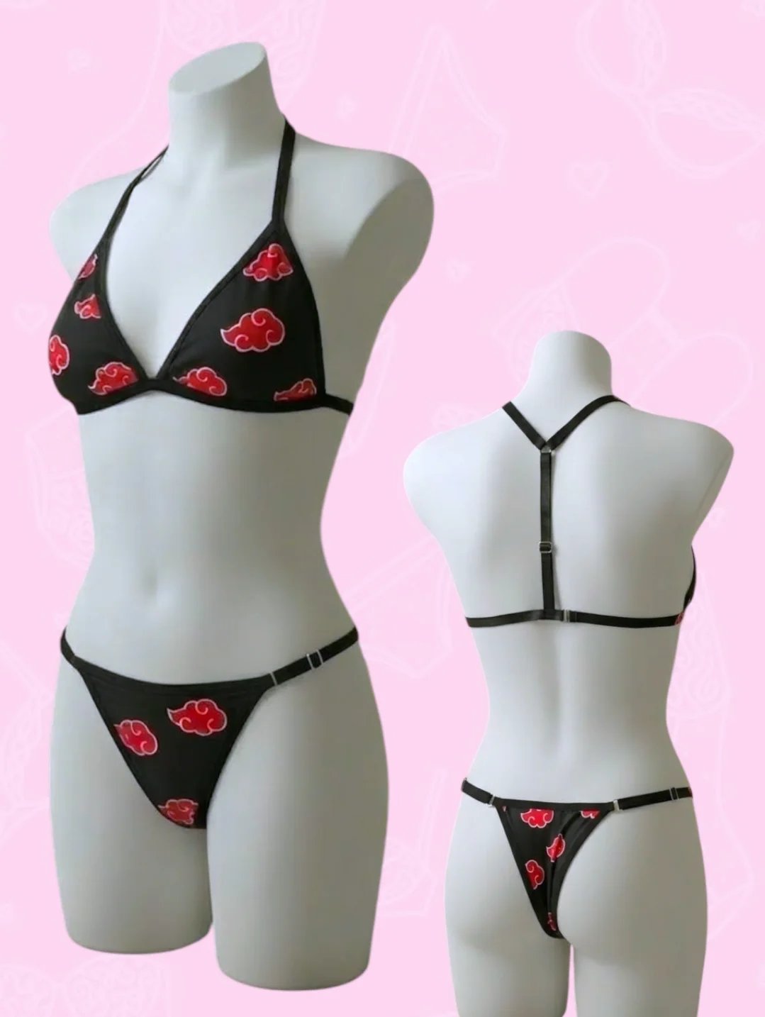 Set estampado de akatsuki diseñado originalmente por nosotros. Elaborado en licra, con bordes en sesgo elastico mate. Ajustable de largo de tiras de hombros y panty.