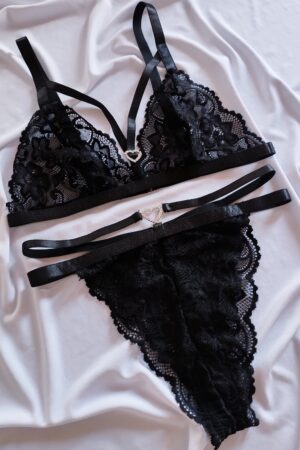 Set de lencería super cómodo (además de hermoso) ideal para uso diario, sobretodo si no te gusta usar sostenes convencionales de varillas. Bralette de encaje suave con tiras de realce en el busto y un corazon en pedreria (fantasia) y panty corte medio con detalle a la cintura de corazon a juego con el bra. Regulable de tiras de hombrros.