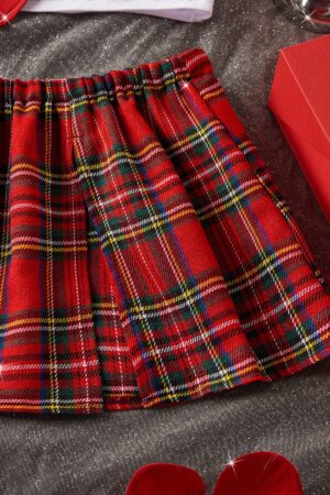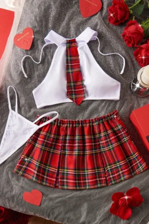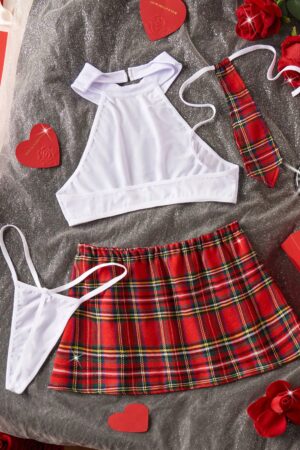 6 PIEZAS: Corbata, top, falda, hilo y 1 par de medias a la rodilla/muslo blancas de nylon.
