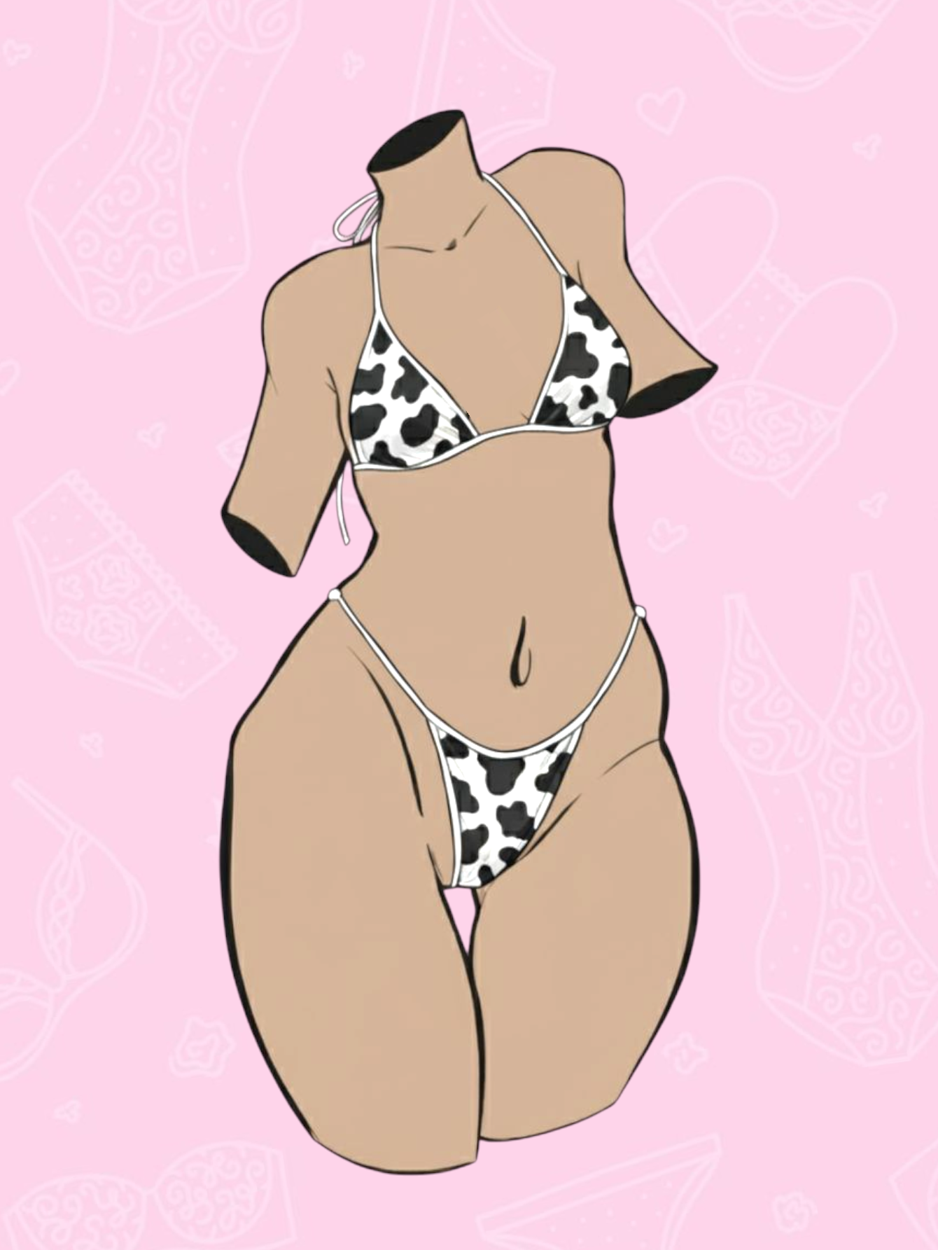 Set estampado de vaquita muuy sexy. Elaborado en microfibra, con bordes en sesgo elastico mate. Ajustable de cuello, espalda, panty y bra (los triangulos pueden ajustarse para que cubran segun se desee.)