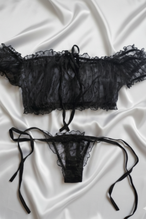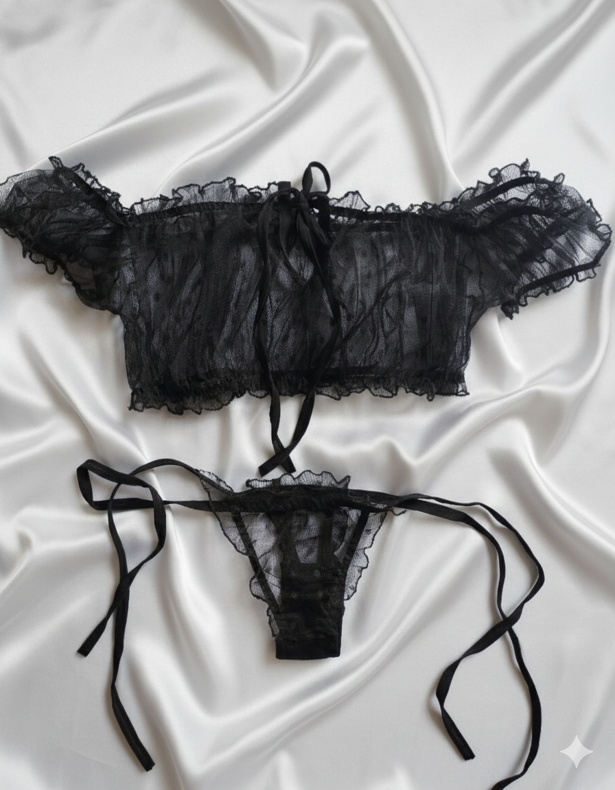 Set elaborado en malla traslucida 80% de color negro con detalles de puntos en relieve. Ajustable de panty y top, se anuda la panty y el top tiene goma y nudo en el centro. La tela es elastica.