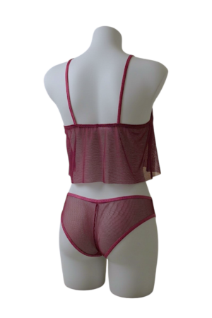 Set de lencería super cómodo (además de hermoso) ideal para uso diario y andar por tu casa como una top model. Color vinotinto, de encaje suave y malla traslucida. La panty cubre 3/4 de gluteo y es de corte medio.