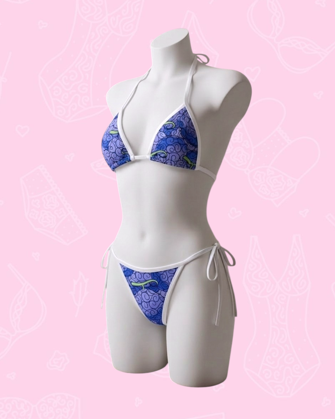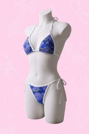 Set estampado de la fruta Gomu Gomu de One Piece. Diseñado y confeccionado por nosotros. Elaborado en microfibra, con bordes en sesgo elastico mate. Ajustable de cuello, espalda, panty y bra (los triangulos pueden ajustarse para que cubran segun se desee.)