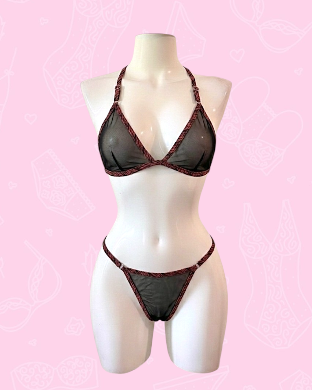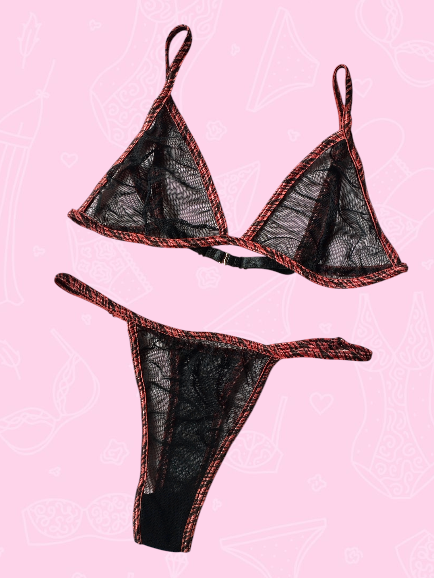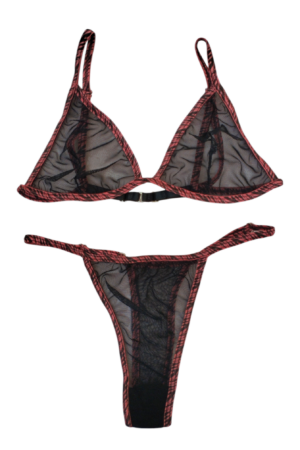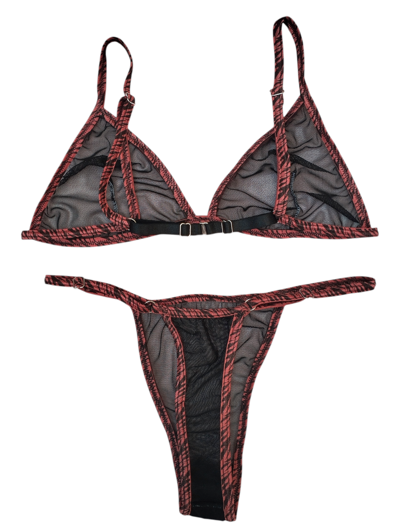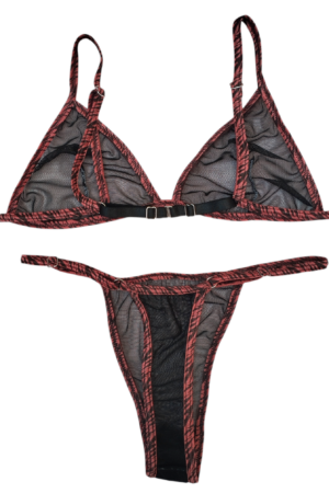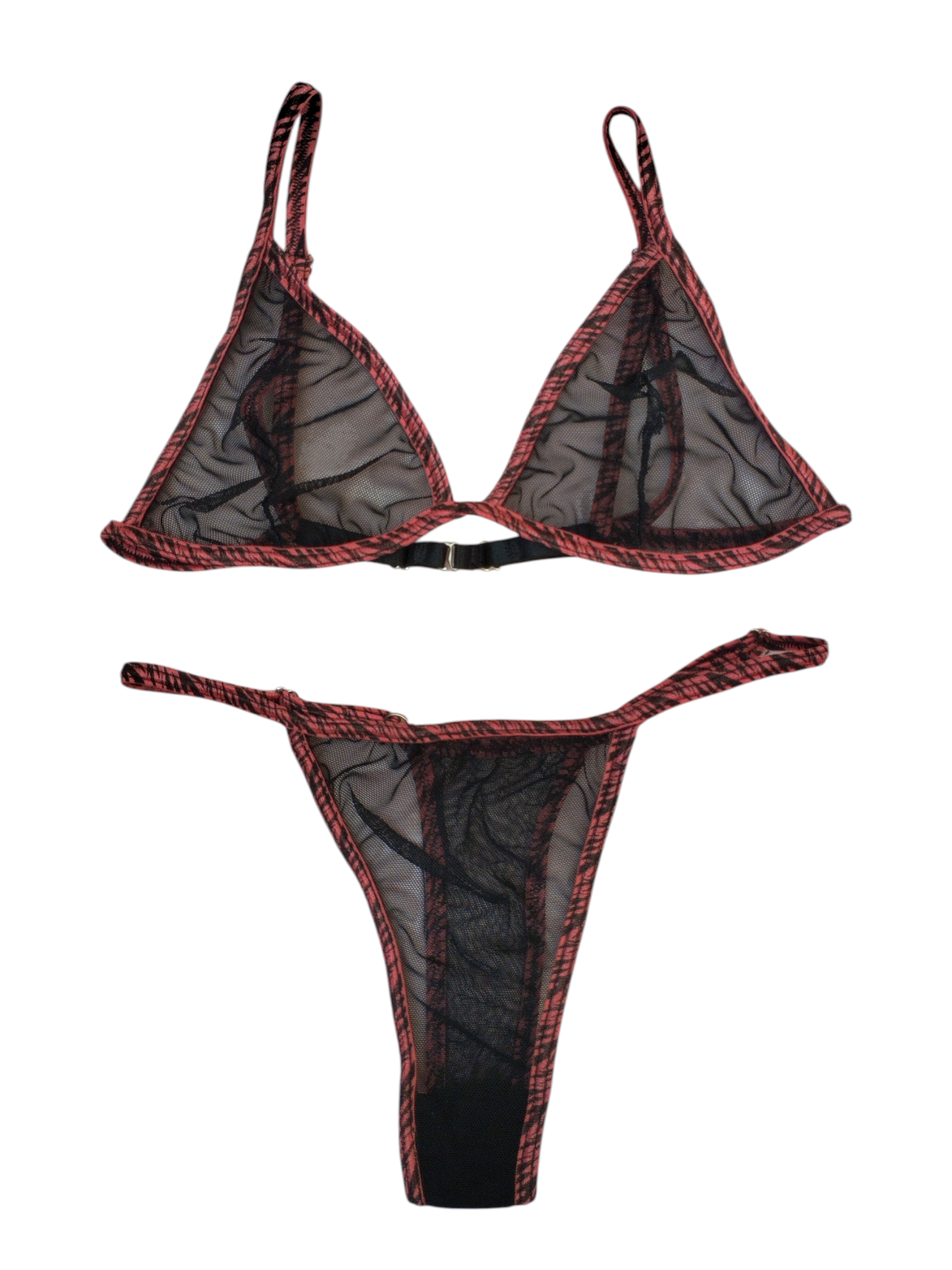 Este conjunto de lenceria en malla es delicado, comodo y sexy. De malla traslucida con sesgo en bordes estampado de animal print, panty tipo semihilo, sosten con hombros y espalda regulables.