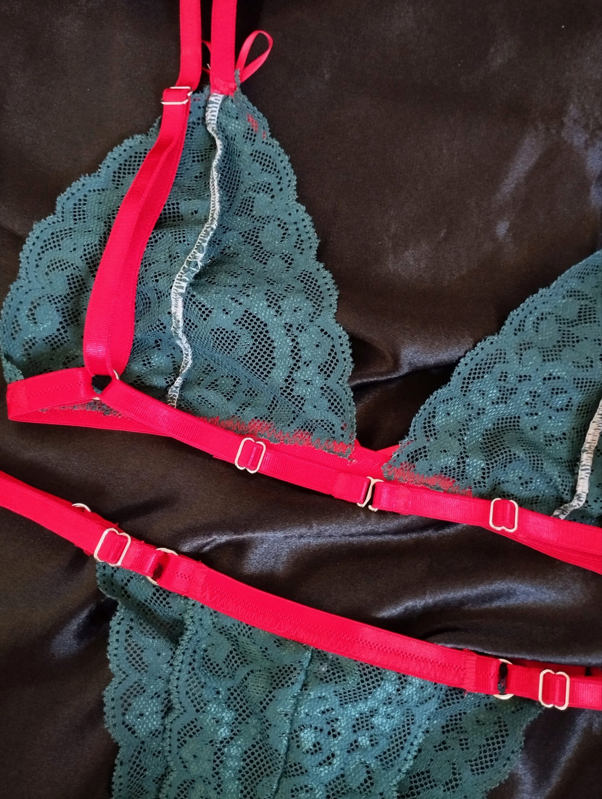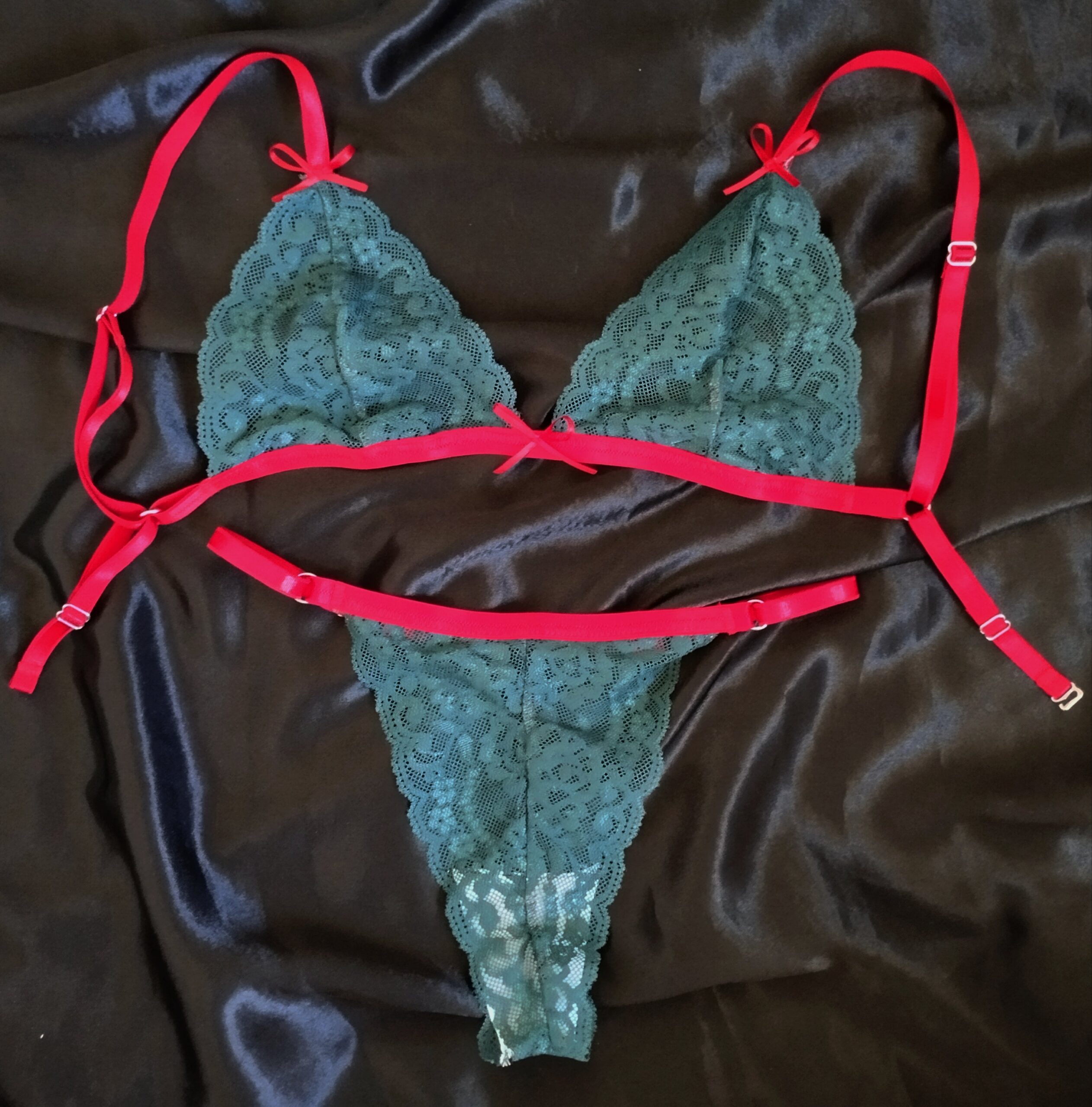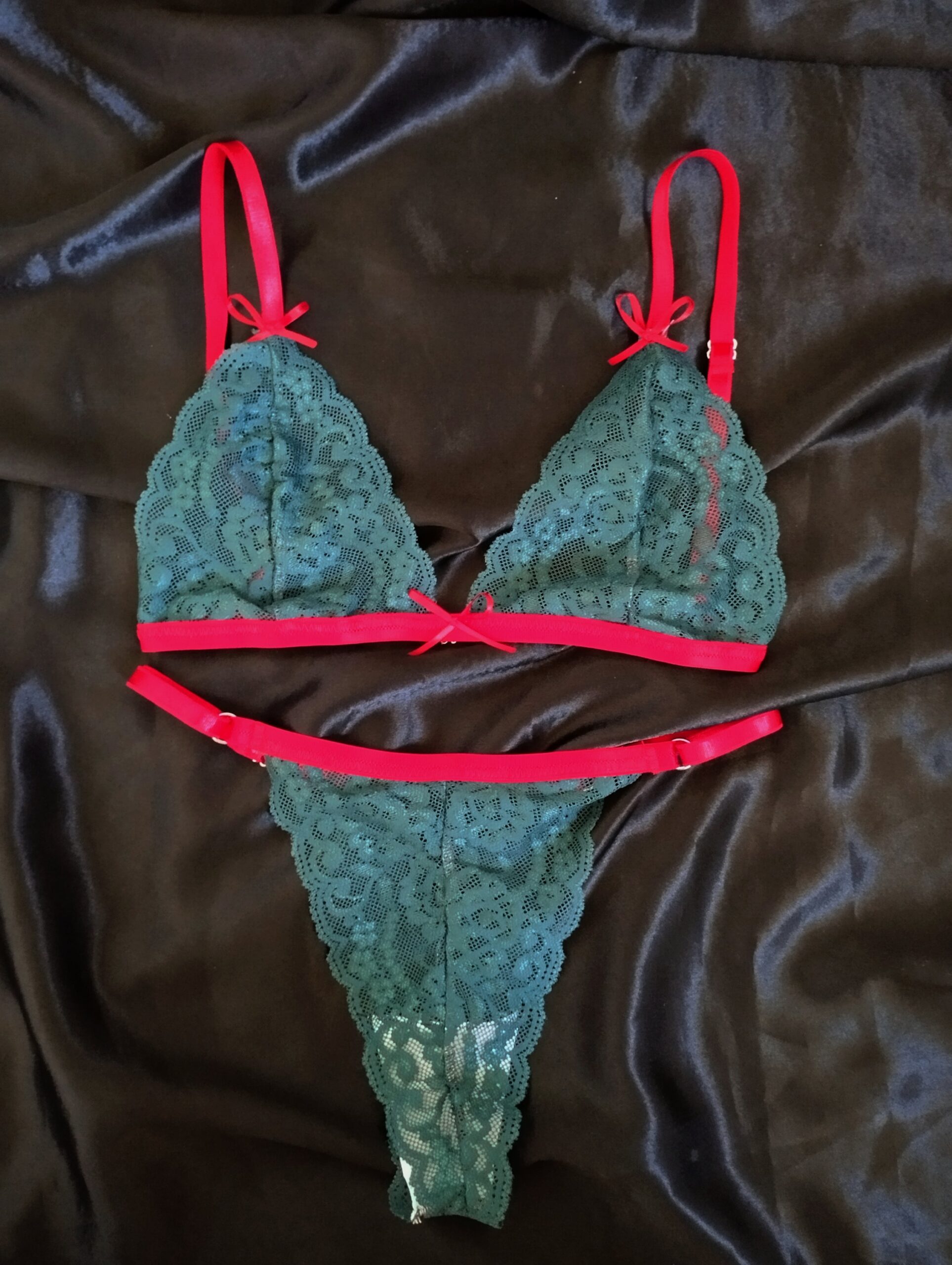 Lenceria muy navidena con colores para la temporada. Bralette de encaje suave elastico sin varillas y panty estilo semihilo. Todo ajustable de hombros, espalda, y cintura.