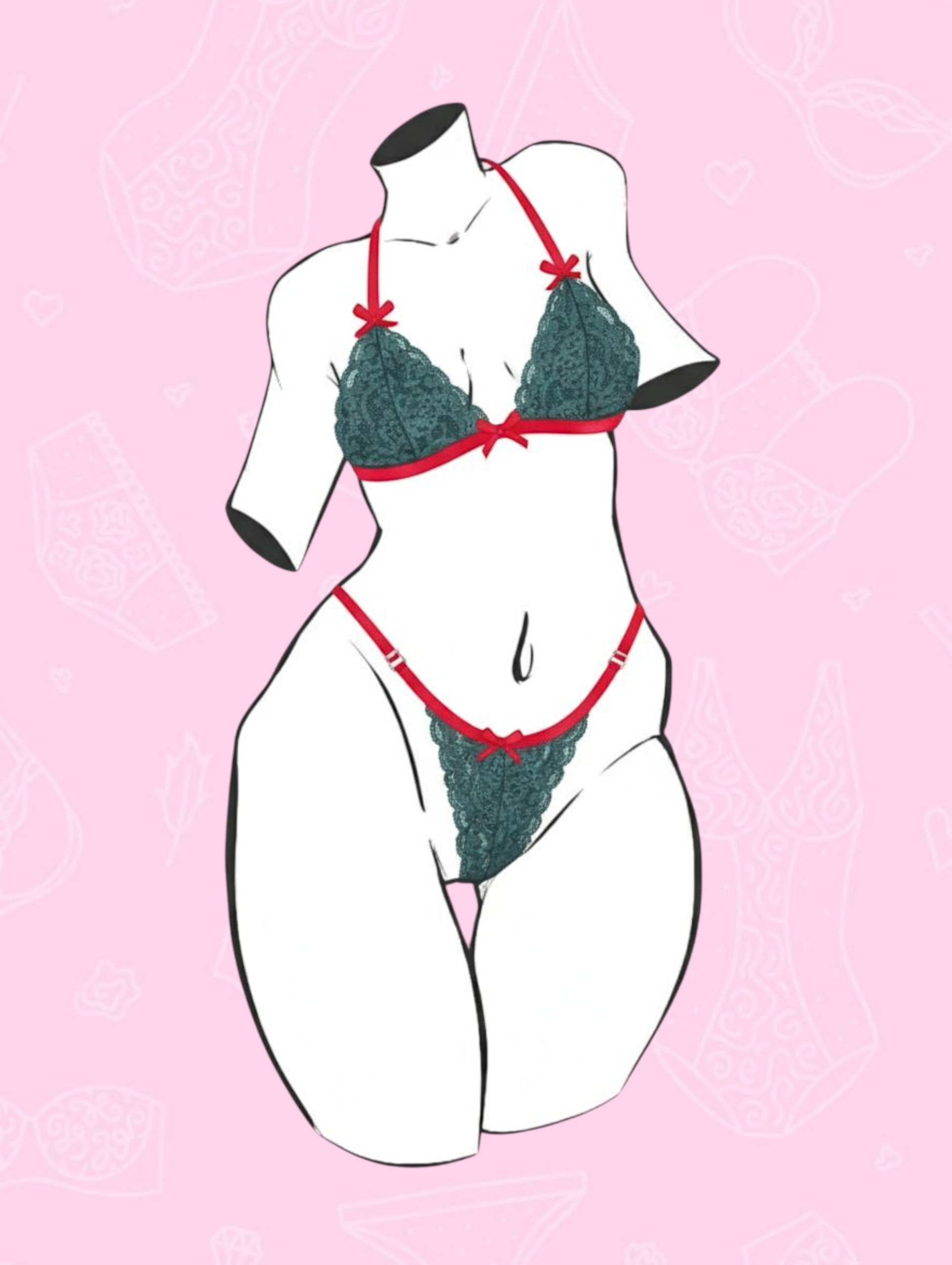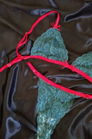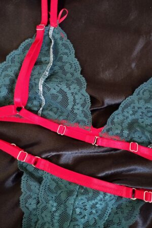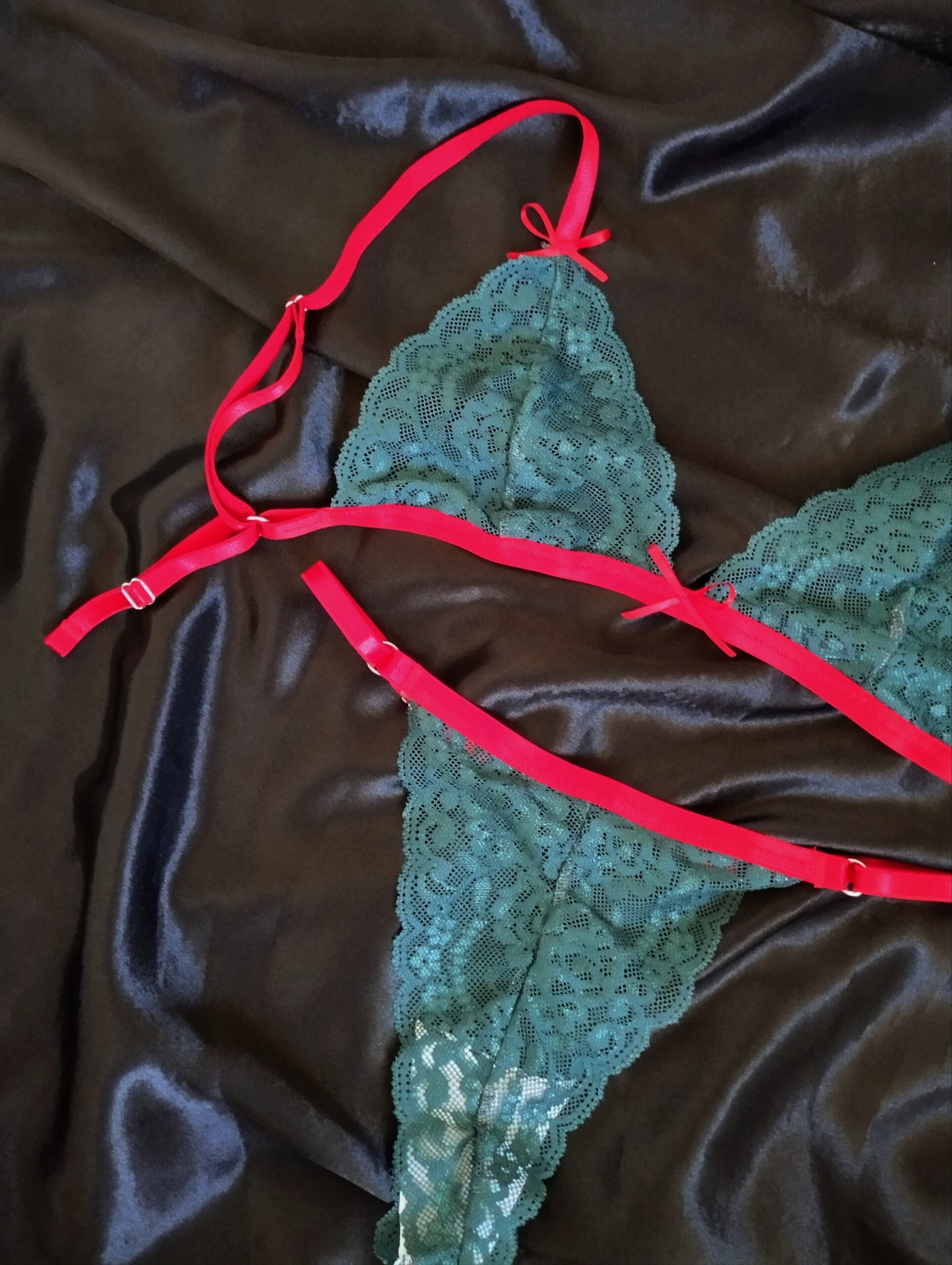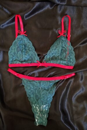 Lenceria muy navidena con colores para la temporada. Bralette de encaje suave elastico sin varillas y panty estilo semihilo. Todo ajustable de hombros, espalda, y cintura.