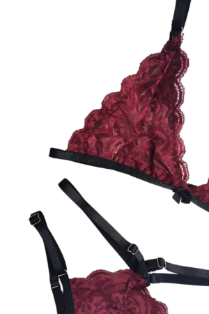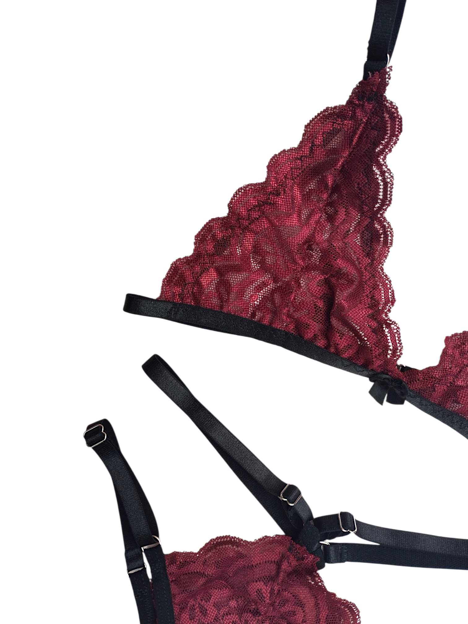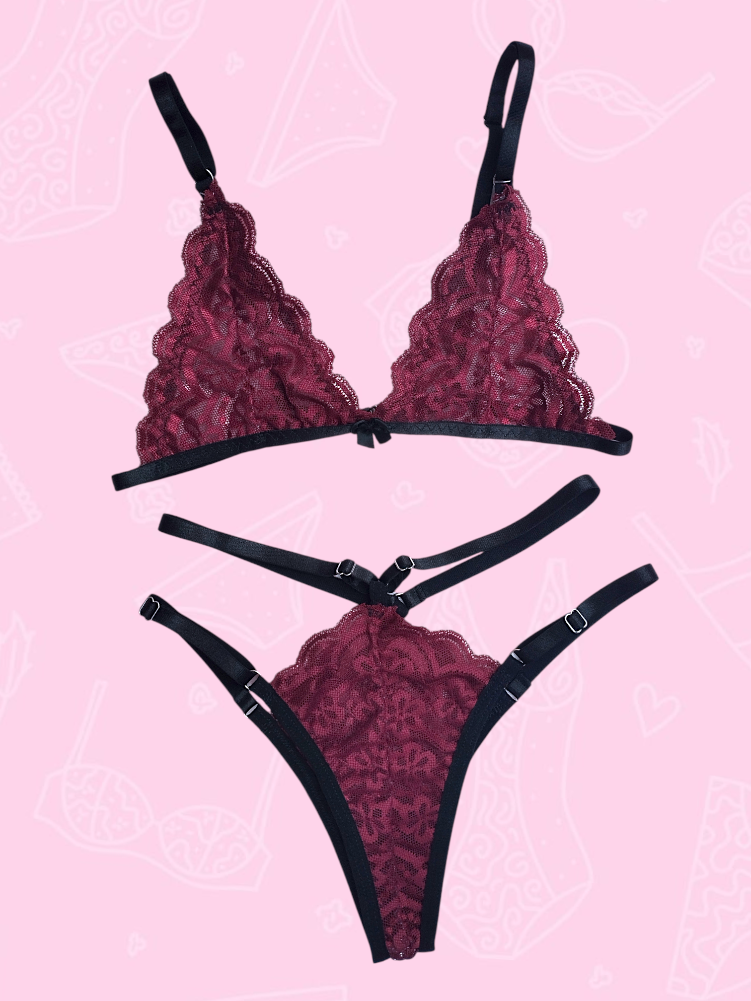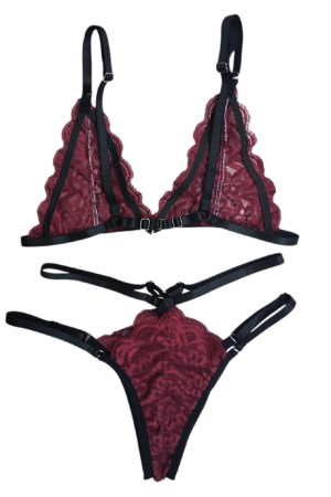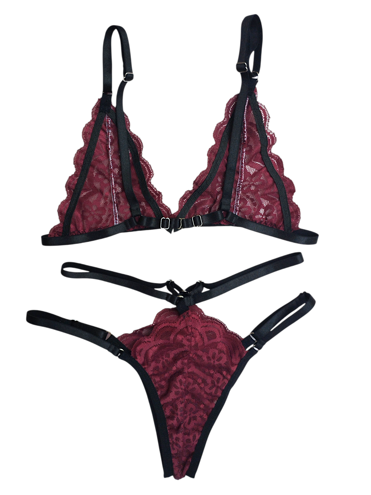 Lenceria de encaje elastico y suave en colores a contraste, con bralette sin varillas y panty tipo T hacia cintura. Regulable de TODAS las tiras. La panty es igual delante y detras, con forro en la parte intima. El bralette tiene gomas en la parte interior para mejor soporte.